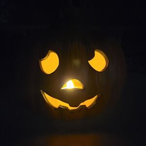 Charming ceramic jack-o’-lantern with a cheerful carved face. Warm orange glaze with a rustic brown stem. Great for shelves, mantels, or Halloween displays. In excellent condition.