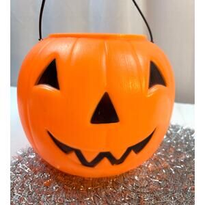 Jack-O-Lantern Halloween Trick or Treat Blow Mold Candy Bucket. It measures 7.25" tall (without its handle)x 9" wide. Preowned condition. A few marks/indents on the black handle- see photos.