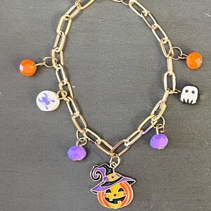 1) Jack-O'-Lantern with a Witch Hat Metal Enamel Pendant Paper Clip Chain bracelet. Bracelet has orange & purple faceted beads as well as spider and ghost beads