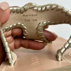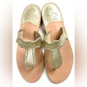 Step out in style with these elegant gold leather sandals. Perfect for any occasion, these sandals offer both comfort and sophistication. Slip on, whip-stitch in excellent used condition.