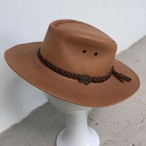 Nice vintage hat please look at the pictures. Made in Australia from kangaroo hide, inside along the rim has discoloration which I show in pictures. Back has a watermark about the size of a quarter. Front to back measured 7.5’s crown. Height is approximately four Greenwood is almost 3 dark tan in color with brown braid.