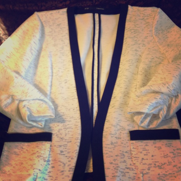 Black trimmed short waisted open front jacket with rouche sleeves.