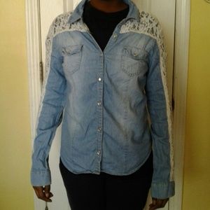 Button down Jeans jacket with lace back and half lace sleeves and double beeast pockets.