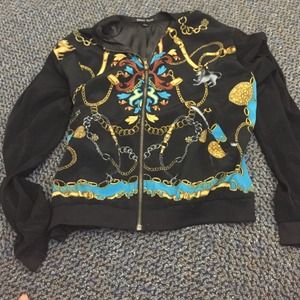 Black silk like jacket from forever 21. Black with an abstract design spread across the from and back. The design is made up with drawings of chains and lockets gold blue and red. It has a gold zipper down the front.