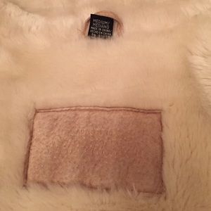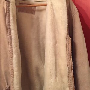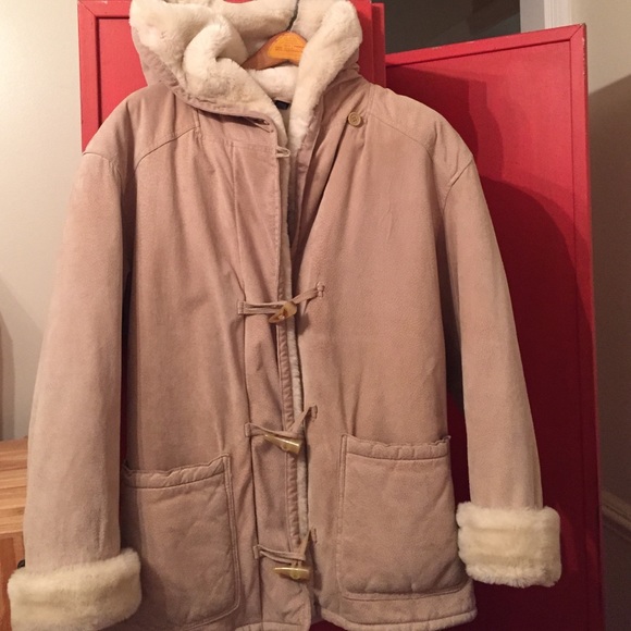 Outer shell leather with fake fur inside hooded and side pockets very warm and super comfortable.