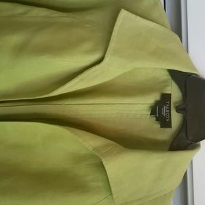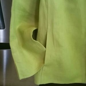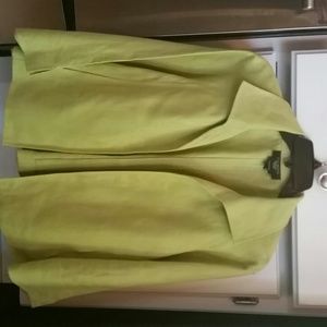 Pale green linen unlined jacket. Open front with spread collar. Inset pockets and 3/4 length dolman sleeves. Perfect condition. Just dry cleaned