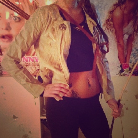 It's a small tan leather jacket, not real leather of course. I wore it once for Halloween as Katniss. So it is in perfect condition. It's super cute for fall and would look nice with a scarf! I am accepting offers. No Trades!