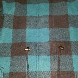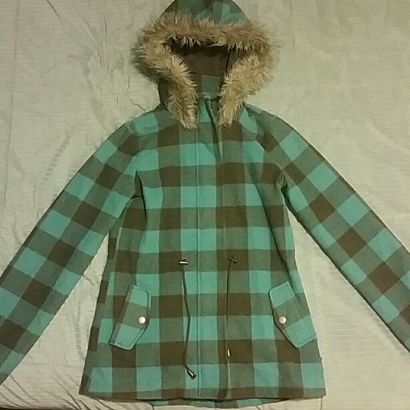 Turquoise and brown jacket. Very warm. Has 2 front pockets, fuzzy hood. Zips and snaps closed. Second picture shows the colors best.