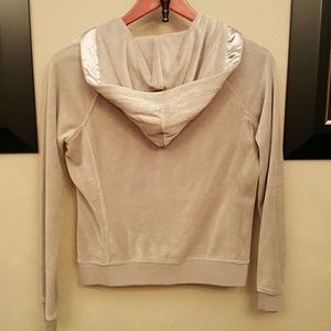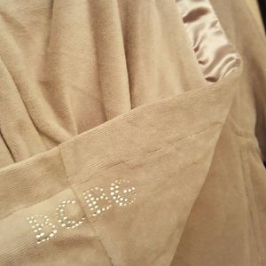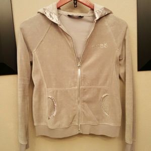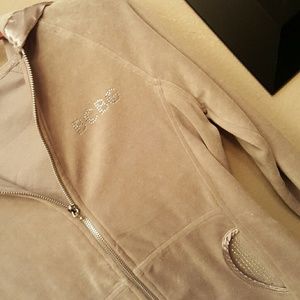 Velour Bling Jacket with satin trimmed hood, bling detailed pockets, BCBG logo on hood and front chest.