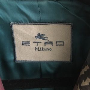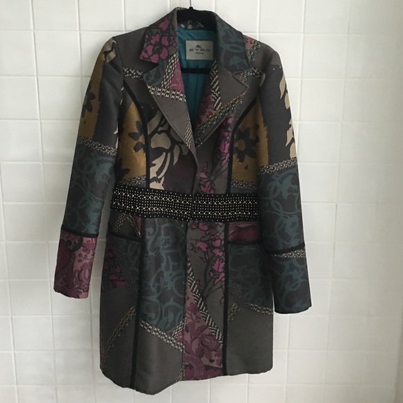 Etro long jacket with brass beading around waistline- teal, plum grey