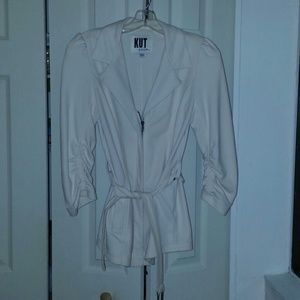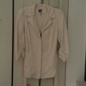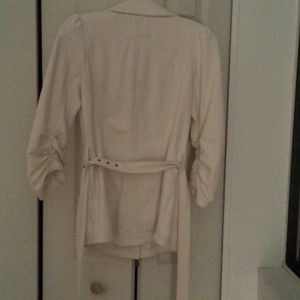 Cream colored. Light and great for fall. 3/4 gathered sleeves. No flaws other then some fuzzies on the inside. 60% cotton 40% polyester