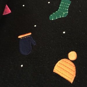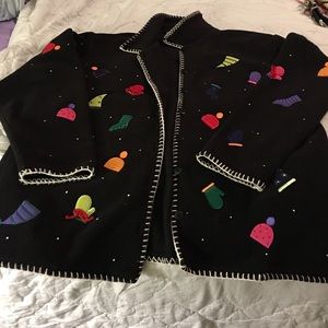 Polyester fleece jacket. Very warm, very cute for holidays or snow days. Sewn on details. Excellent condition. Just makes you feel good. Fits right below your behind.