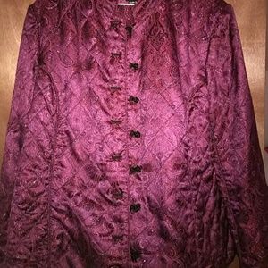 Beautiful gorgeous long sleeve jacket. I tried my best to capture the beauty of it. The pattern is very detailed and beautiful. Colors consist of purple, black, red and marron I have used it on very rare occasions.but it's only sitting in my closetm. Offer if you want to negotiate.