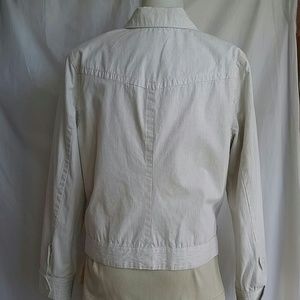 Jacket, with 5 clear buttons down front, vertical side button flap closures, adjustable button waistline with straps, shell 100% Cotton, body lining 65% polyester, 35% Cotton, sleeve lining 100% polyester