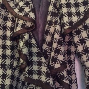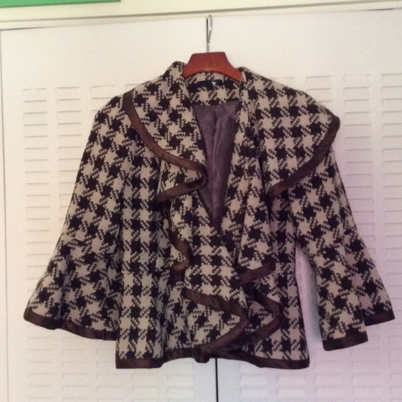 100% polyester, contrast 60% cotton, lining polyester. Pattern with dark brown and beige.3/4 length sleeve. Dry cleaning only. Gently used. Good condition.