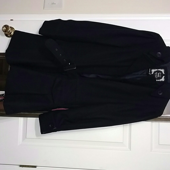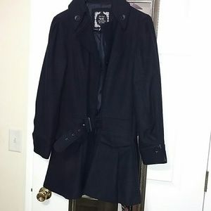 Navy blue jacket. Belted waist. 2 pockets in front.