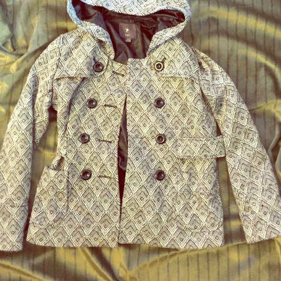 Button-up jacket. Great for mild winter temperatures. Has hood and pockets!