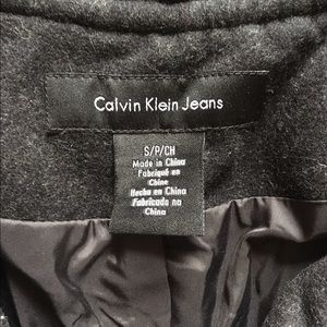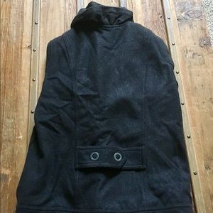 Dark gray, 63% wool jacket with polyester liner. Heavy and warm. Double layered collar and snap closure for extra style and warmth. Heavy button cuffs.