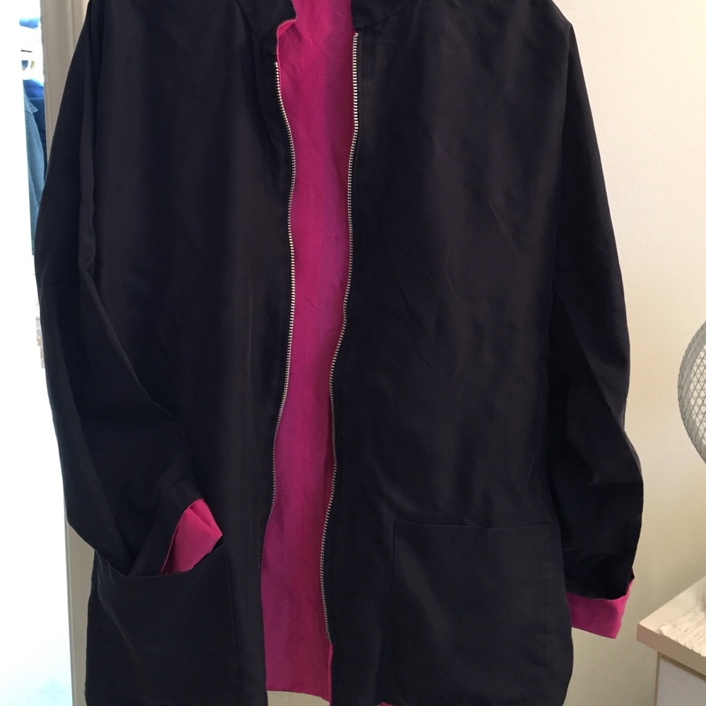 Shanghai Tang silk reversible navy and fuchsia jacket. Long sleeves.