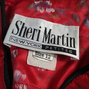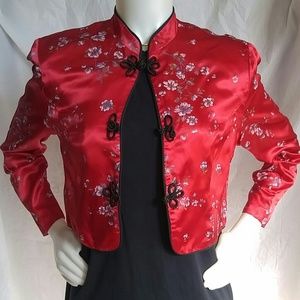 Jacket...mandarin collar, long sleeves, floral print, 3 floral cord front closures, 100% acetate