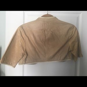 Cropped leather jacket. Tan color with a cream pipping around the jacket. Size small. Great condition