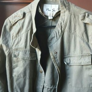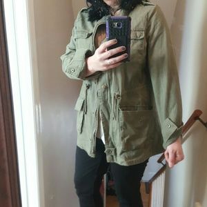 Hunter Green "camo" style jacket. Great for spring or fall has 2 big pockets and a drawstring at the waist to pull if you want it tighter at the waist makes it look very flattering and feminine for a green camo style jacket. Very popular style right now. Like brand new no stains no rips no tears. I only wore it 2 times and have so many similar to it.