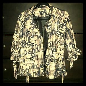 Forla Paris waist jacket with waist tie and arm ties. 1/2 sleeves (above elbows). Double breasted with a cute, neutral colored background with black circular patterned design. Jacket has side pockets and a black lining. Only 1 prior owner.