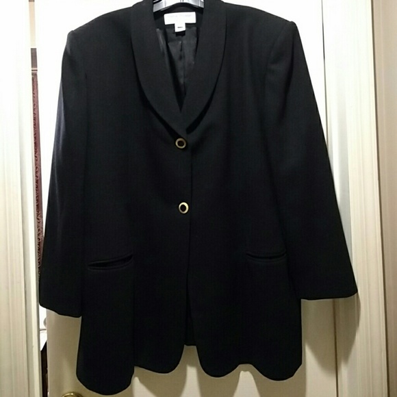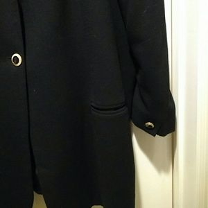 Fully lined, shoulder pads, front pockets, two button gold and black front closure, one button on bottom of each sleeve jacket blazer.