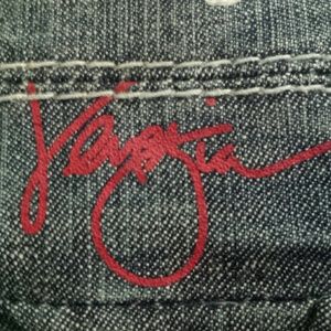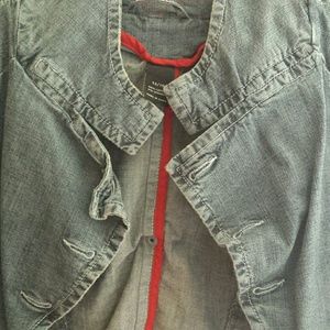 This is a short jean jacket it doesn't button up..red lining in the inside.