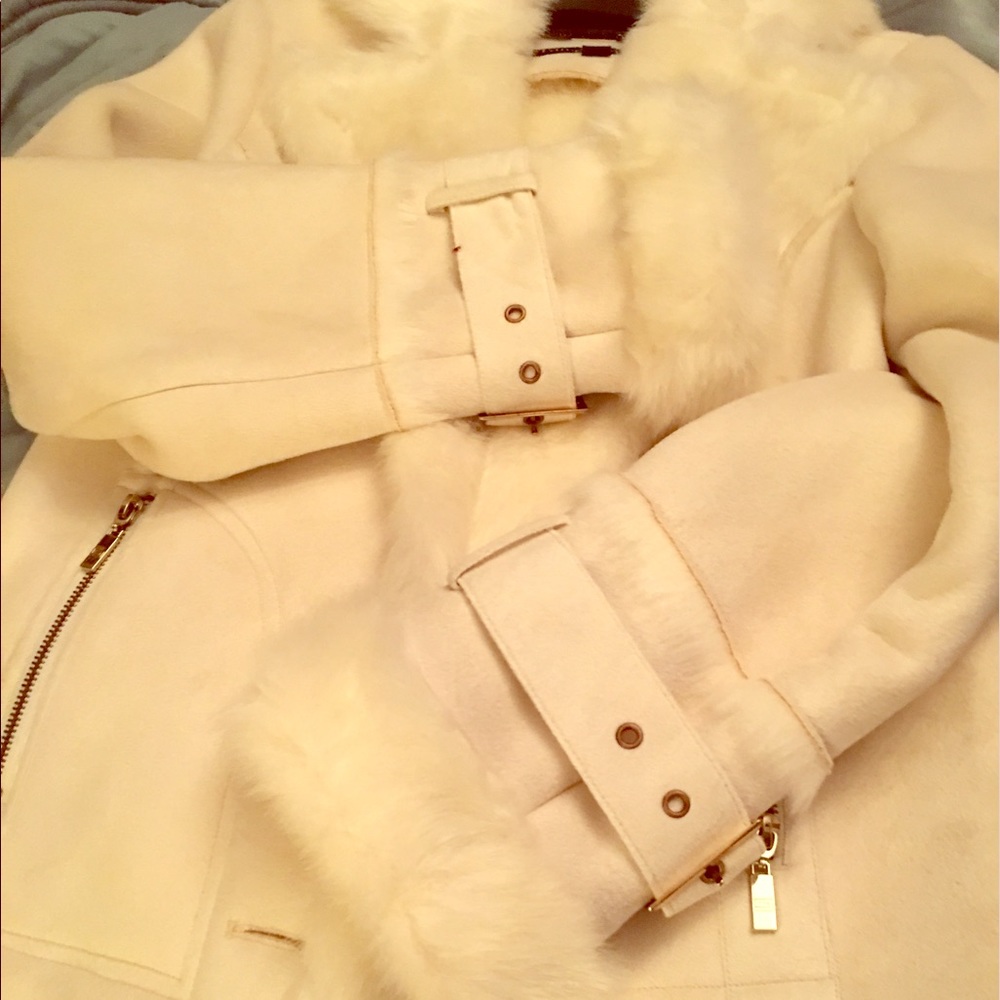 Beautiful white cozy jacket with gold accent. Very warm and soft.