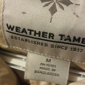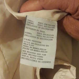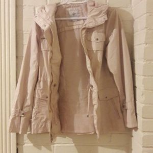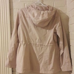 Cream all weather jacket with upper and lower pockets inside and outside drawstring with hood front zipper/snap