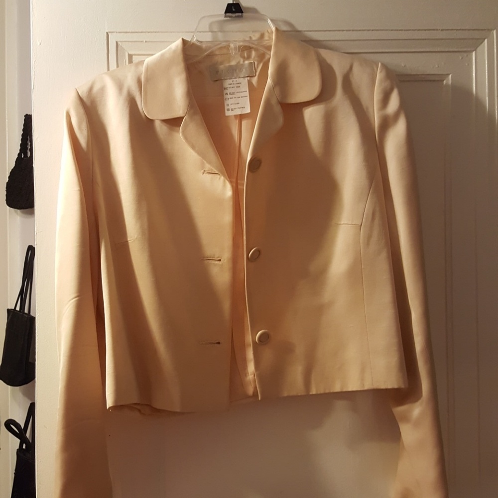 Ivory bolero style formal jacket. Acetate and vicose material. Lined. 3 button extra button included. Made in France. Size Medium. UK size 18