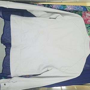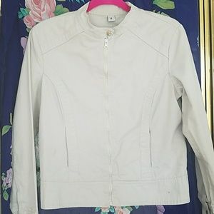 Off white/tan. Zippered front with a button at the kneck. Nice well worn denim cotton with pockets))) purchased on a fall trip to New York while in my youth))))