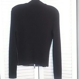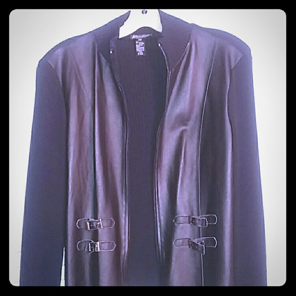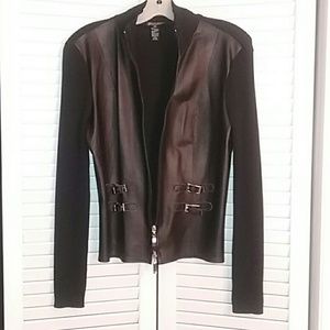 This is a knit and genuine leather zip up jacket. It's made of 65% rayon 35% nylon and 100% leather