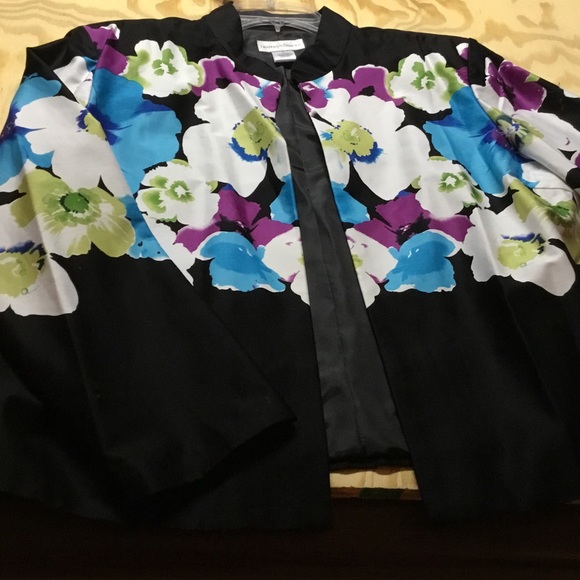 Light weight jacket polished cotton black with all around print of different colors. Never worn. Very pretty over a dressy black dress