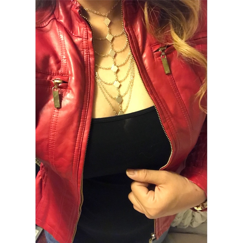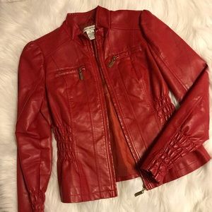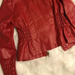 Gently-worn; sexy red fitted (faux) leather jacket; gold hardware; zippered pockets; ruched sleeves and bodice.