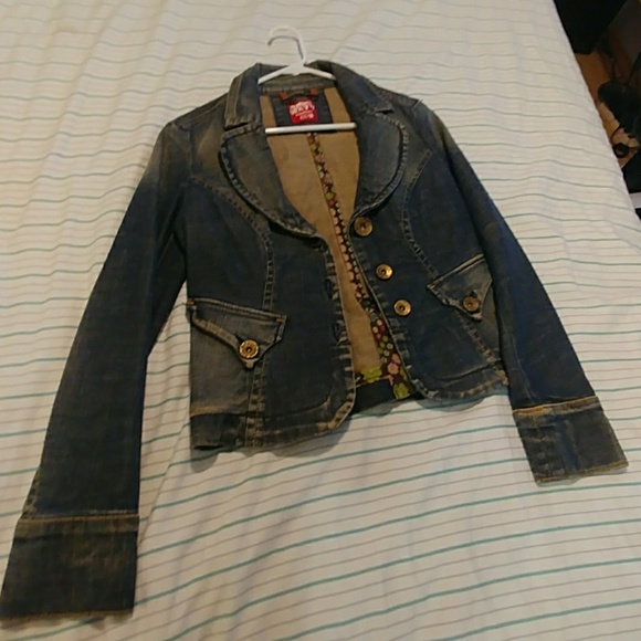 Denim jacket miss sixty it says medium but its pretty fitted. Buttons still attached