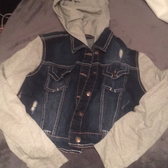 Jean jacket, shorter on the stomach, i would wear something under it. More like a crop jacket.