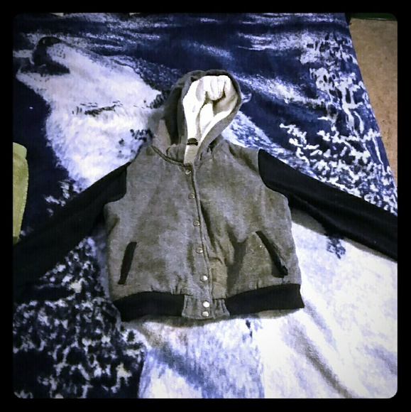 Gray black jacket with a fluffy inside. This jacket is good for being warm in the winter