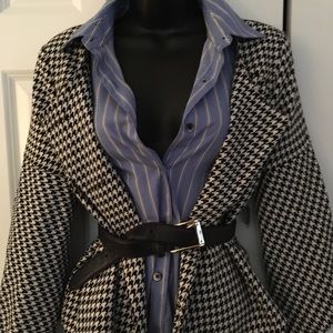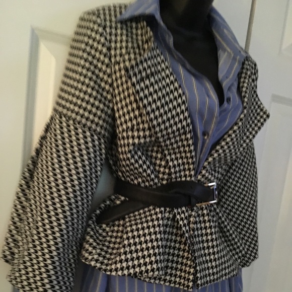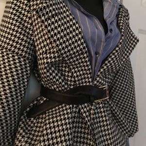 Cute and billow. Black and off-white Houndstooth print jacket. Sleeves are 3/4, which makes styling fun-filled! Make it memorable: slip on a pair of sleek pencil trousers and stilettos, why not?