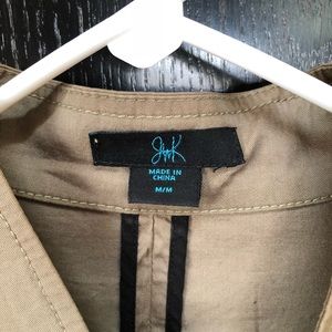 Olive green jacket, it looks more like a khaki color but it’s olive green. The sleeves are a faux leather material. I only wore this a couple of times bc the the sleeves are too long for me. Super cute for fall or spring!