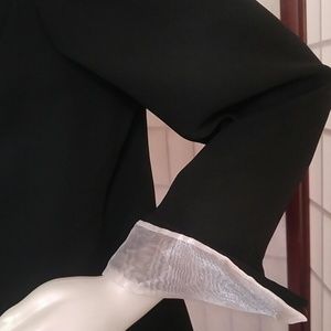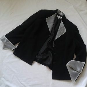 Jacket, button down front, lightly padded shoulders, decorative sheer neckline and cuffed wrist trim, shell and full