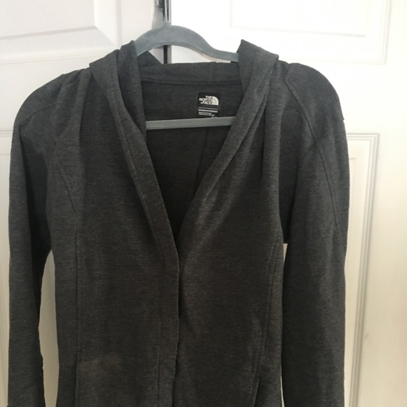 This is super comfortable flattering North Face. Great to use for working out if going out side in chilly weather. It's a snap button down and very stretchy. Only worn twice!