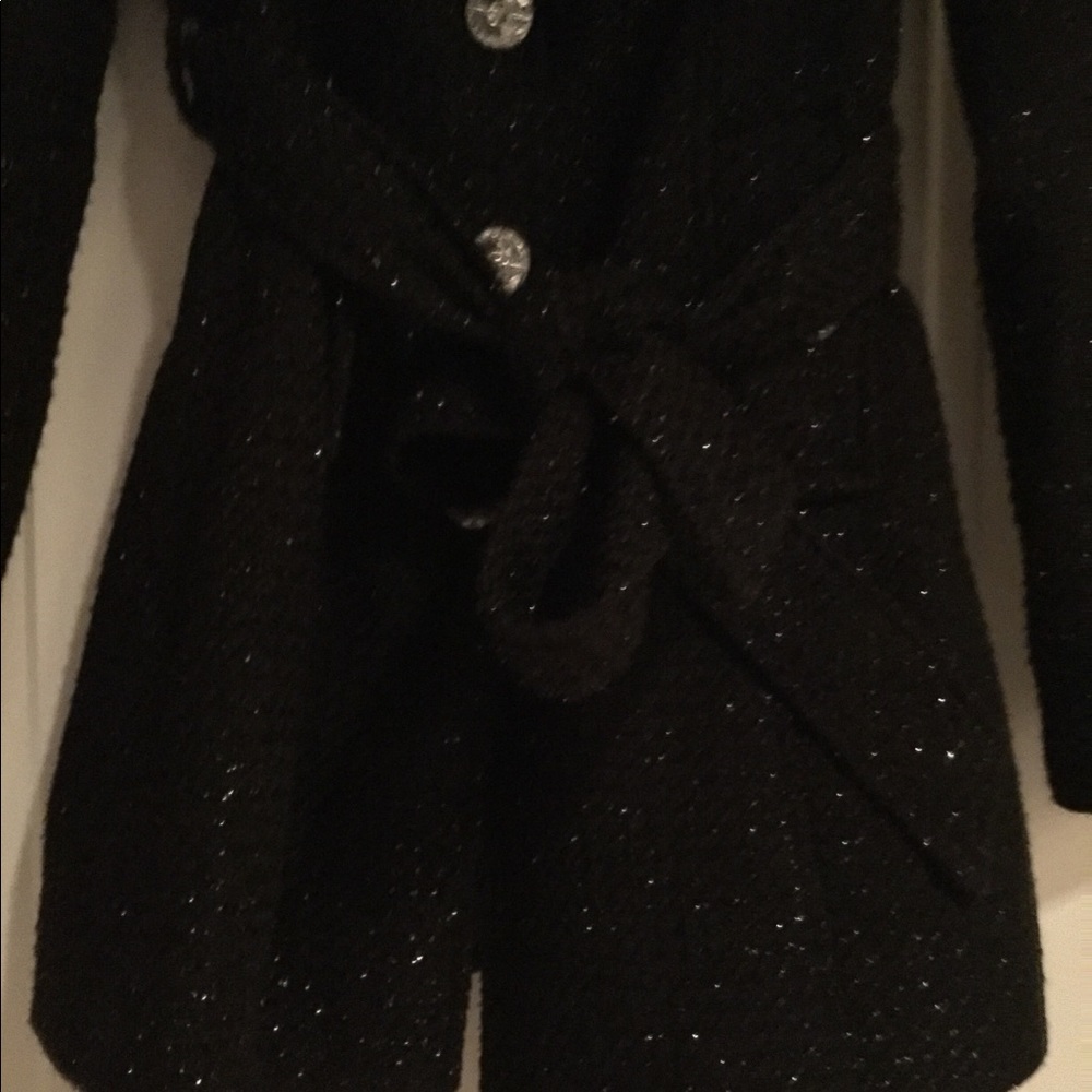 Light weight jacket with metallic threads Ruffle collar that runs down the front. Crystal style buttons Tie belt