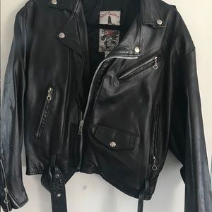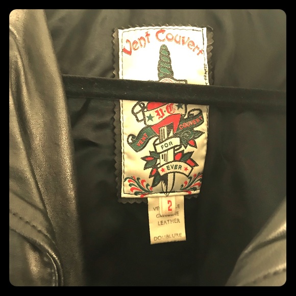 Vent Couvert black leather biker style jacket . Fully lined it zips right up to the neck , 4 pockets , silver buckled belt . This jacket is so luxurious as the leather is like butter . The only sign of wear is slight and just on the zipper tag