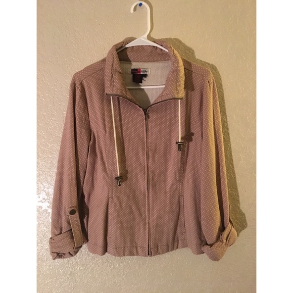 This zip-up jacket will take your outfit to whole new level! It was only worn once. Basically brand new. It looks a bit orange in the pic because of the lighting but it leans more towards a tan / beige / light orange color. It has a small white dot pattern.