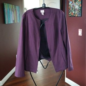 Chicos deep plum color jacket, waist length, stretchy fabric. 2 slit pockets in front. Pewter zipper. Can be worn open or zipped.
