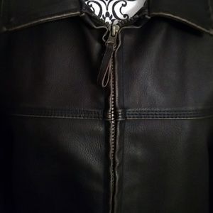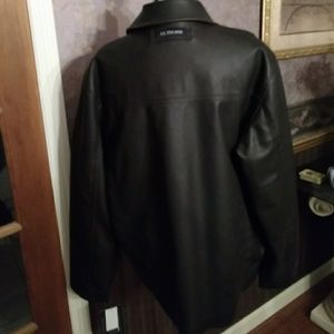 U.S. Polo Association, Dark Brown, collared soft leather slightly distressed look bomber jacket, hanging loop on the back, quilted lining single interior left-hand pocket with button Loop fastening, zipper with leather pull, two large exterior Side Pockets all the quality and style you can expect from Ralph Lauren polo inside color is not faded it is the lighting when taking photo