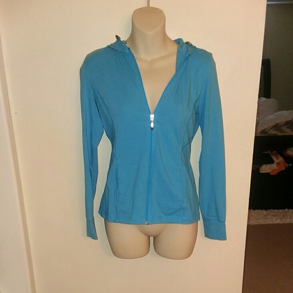 Stretchy athletic/yoga type jacket. Hooded. Small but fits M-L