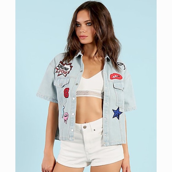 Short sleeve denim Jacket with patches. New with tags and in perfect condition. Comes in s/m and m/l.